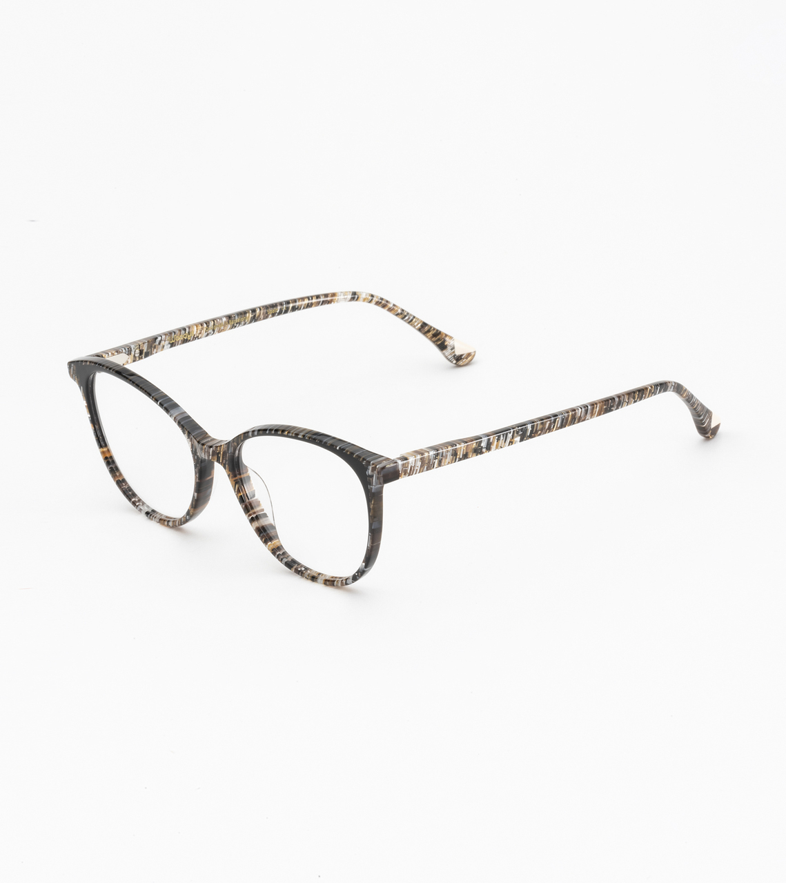 Montura de acetato italiano con laminado. Varillas con incrustación de madera en el terminal y bisagras alemanas OBE Spike.