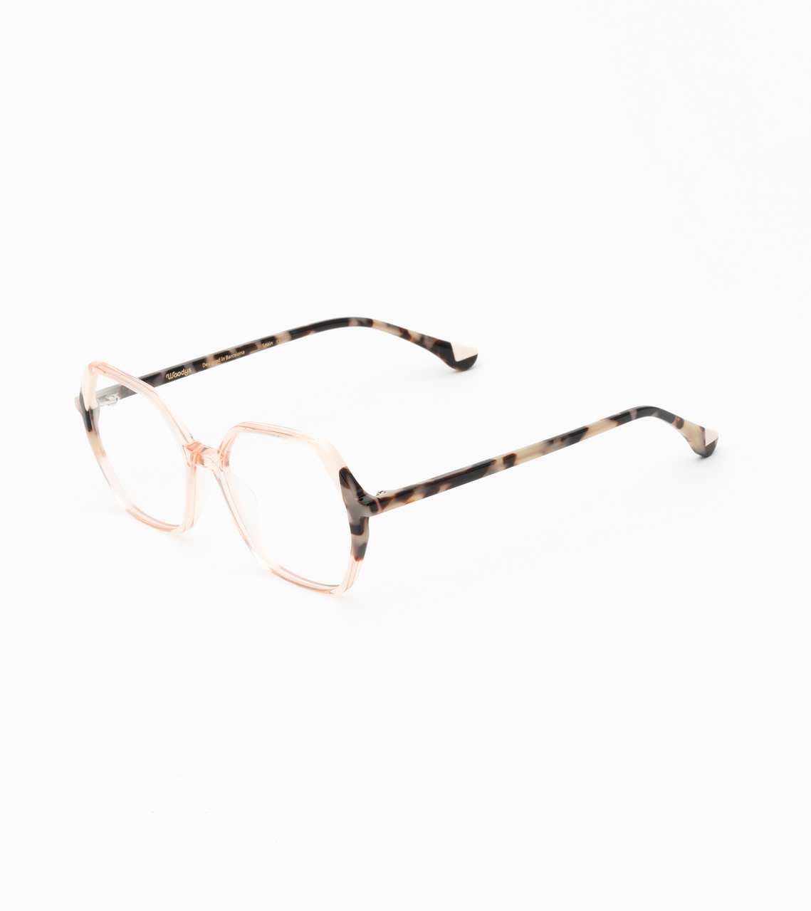 Montura de acetato con doble laminado lateral. Varillas con incrustación de madera en el terminal y bisagras alemanas OBE Spike.