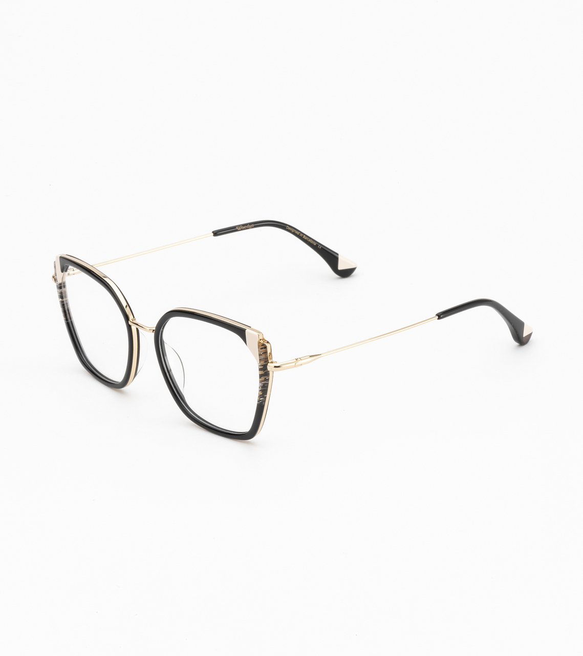 Estructura de metal con aro fino de acetato con doble laminado. Plaquetas ajustables y terminal de acetato.